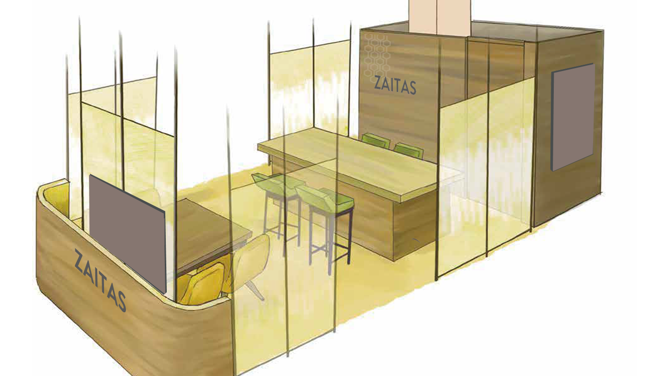カラートーンもウッドと金運を連想させるイエローで構成し、落ち着いて相談できる雰囲気にまとめています。また、パーテーションを入れることで通行者の視線も気にせず相談できるよう配慮。同時に閉鎖的にはせず、人の気配も感じられるようにしました。
