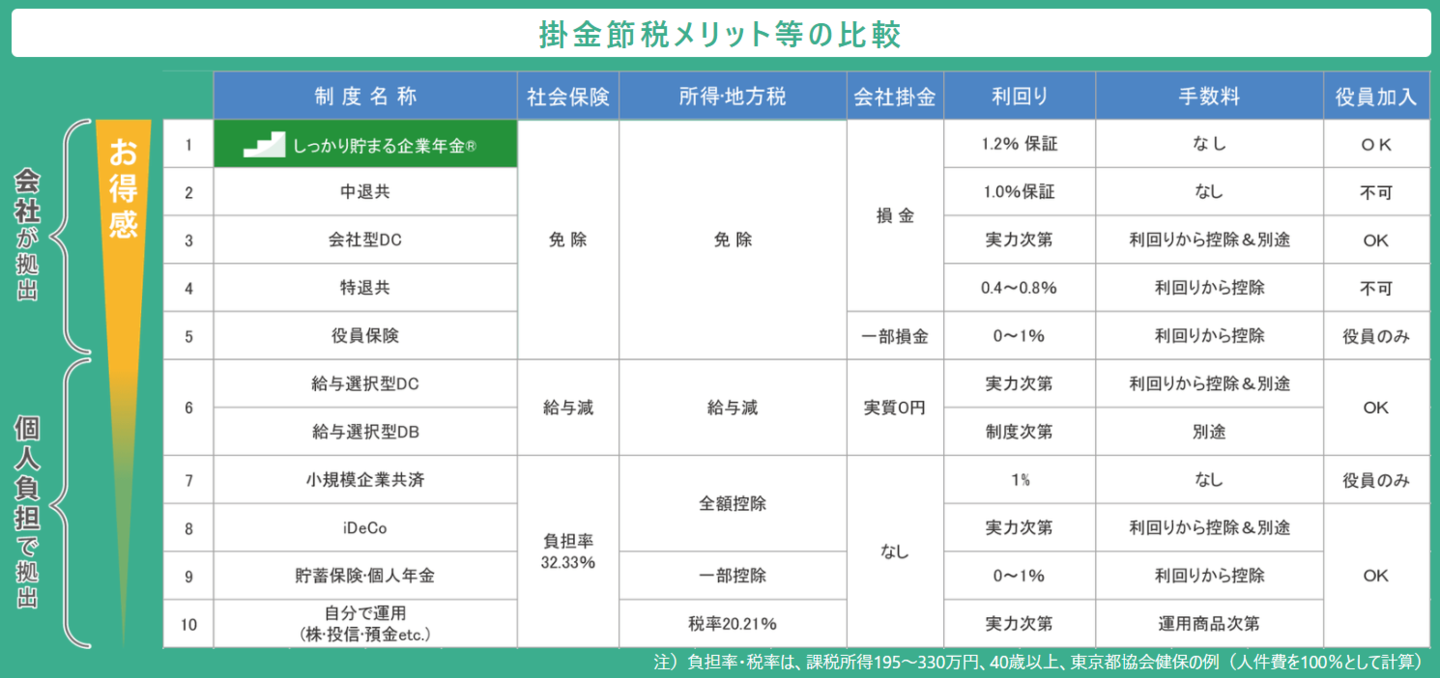 | 事業内容 | しっかり貯まる企業年金®は、経営者、役員の方も加入でき、全額損金が認められ手厚い税制優遇を受けられる退職金積立制度で、積立比率140%強、実質自己資本比率30%強の健全運営、50年以上の実績があります。 |